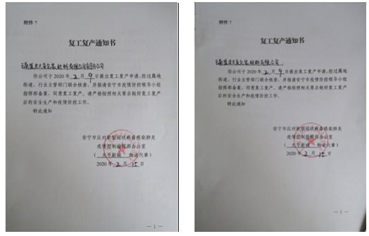 2月3日:1.安寧市工信局對(duì)福保祥瑞公司作準(zhǔn)予復(fù)工復(fù)產(chǎn)批復(fù),感到高興;2.安化社區(qū)借旭潤公司1支紅外線測溫儀使用。