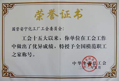 2010年5月,我廠榮獲中華全國總工會授予的 “全國模范職工之家”稱號,這是國家工會組織的最高榮譽,是對于工會建設成果的最高獎項。