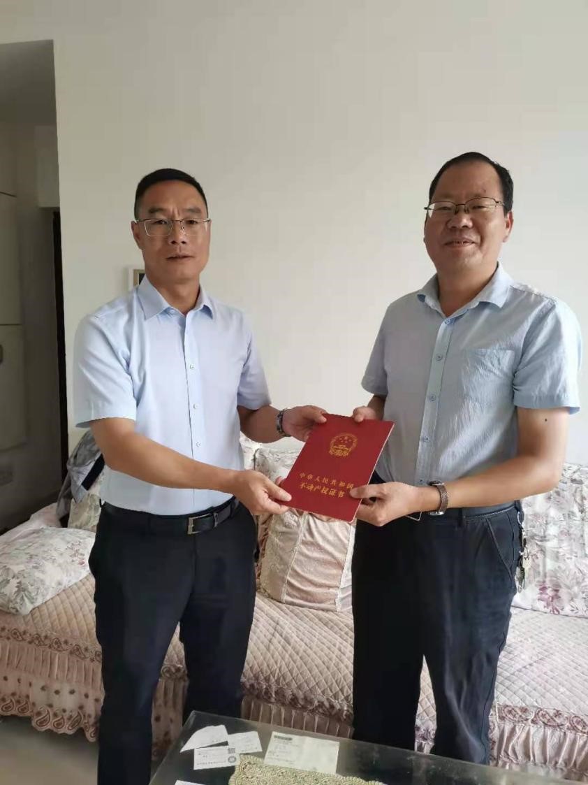 經(jīng)過總部廣大職工住戶及公司長時間的努力及多方面的溝通協(xié)調(diào),7月16日,總部職工家屬生活區(qū)首批16本不動產(chǎn)權(quán)證書辦理完畢,正式交到公司。當日,公司黨委書記高劍帶領工作人員親自將不動產(chǎn)權(quán)證書送到職工住戶手中。