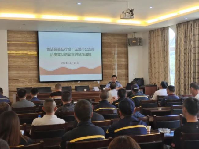 活動二:邀請玉溪市公安局治安支隊危管科余勇警官宣講《安全生產(chǎn)法》《云南省生產(chǎn)經(jīng)營單位安全生產(chǎn)主體責任規(guī)定》,余勇警官結(jié)合自己實際工作經(jīng)歷生動地講解了所涉及的法律條款內(nèi)容。